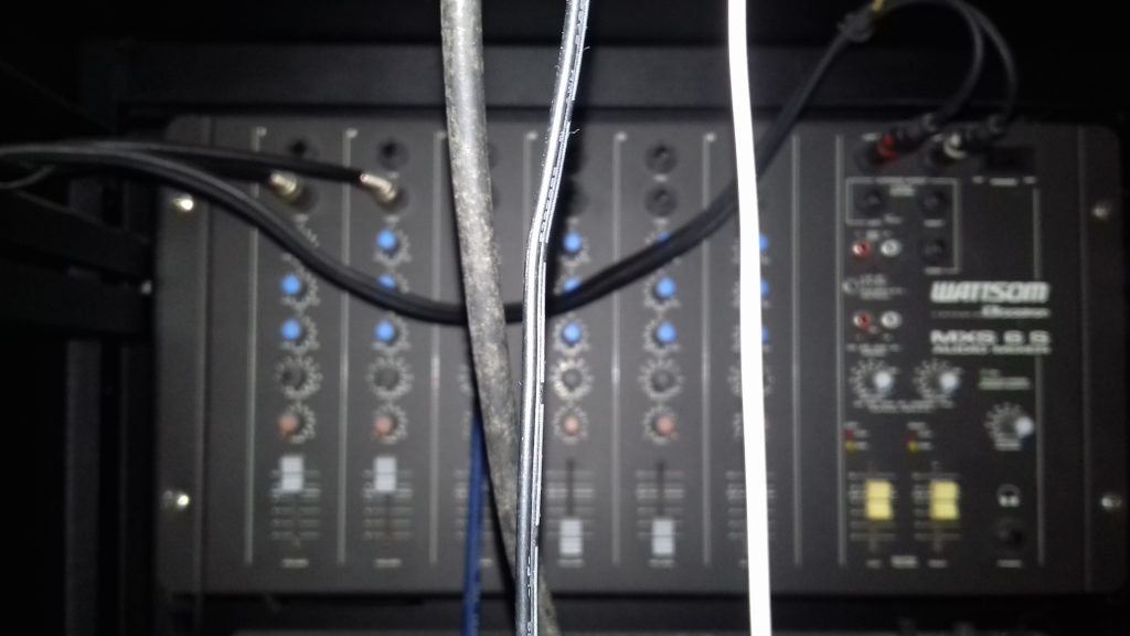 Mesa de som da gravação (canal 1 e 2 – saída da placa de áudio canais esquerdo e direito, canal 3 – cabo azul, retorno da mesa de som do computador)